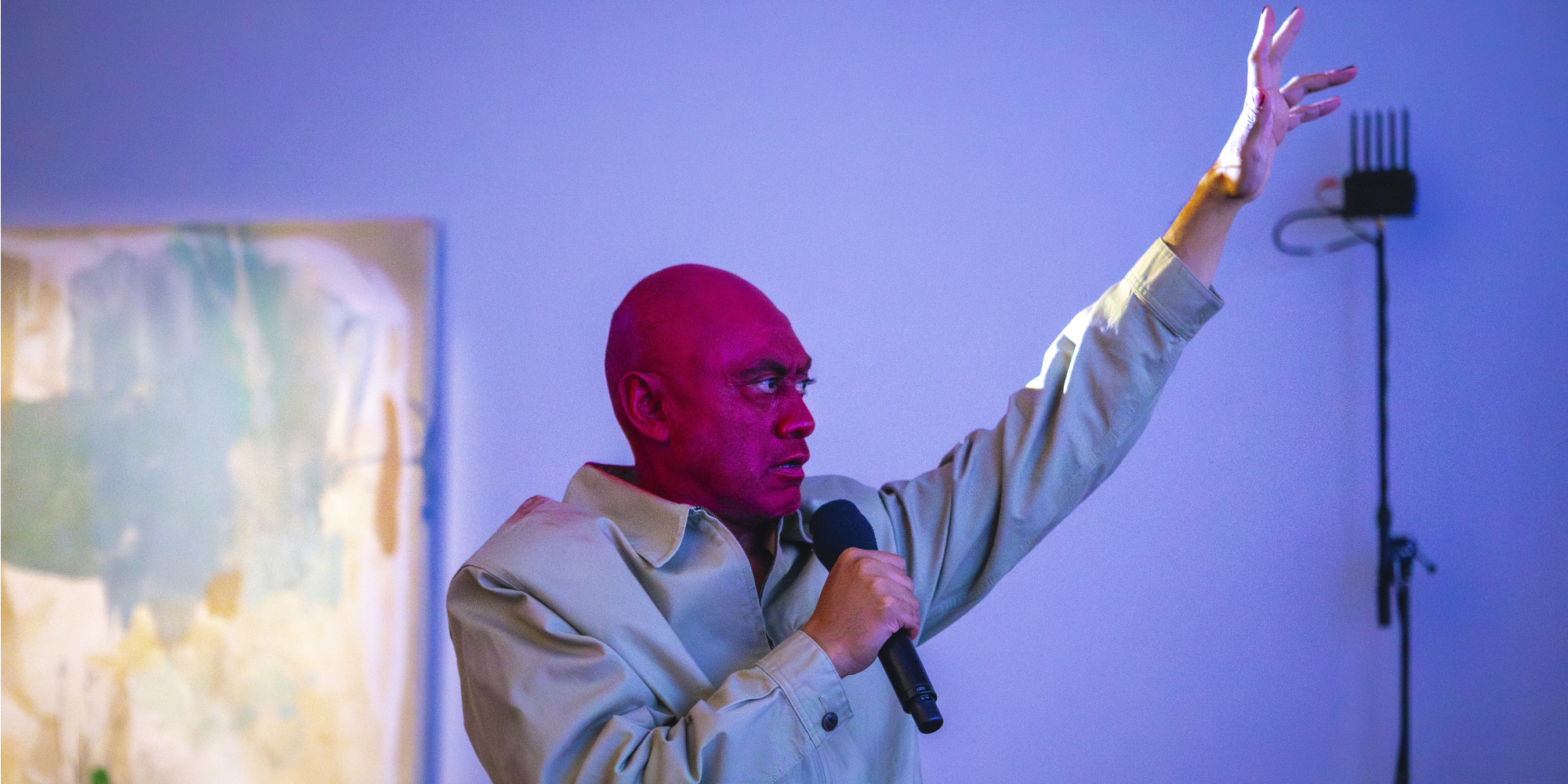 Brian Fuata performance at the Biennial opening weekend, Art Gallery of South Australia, 2026. Photo: Clare Elvia.
