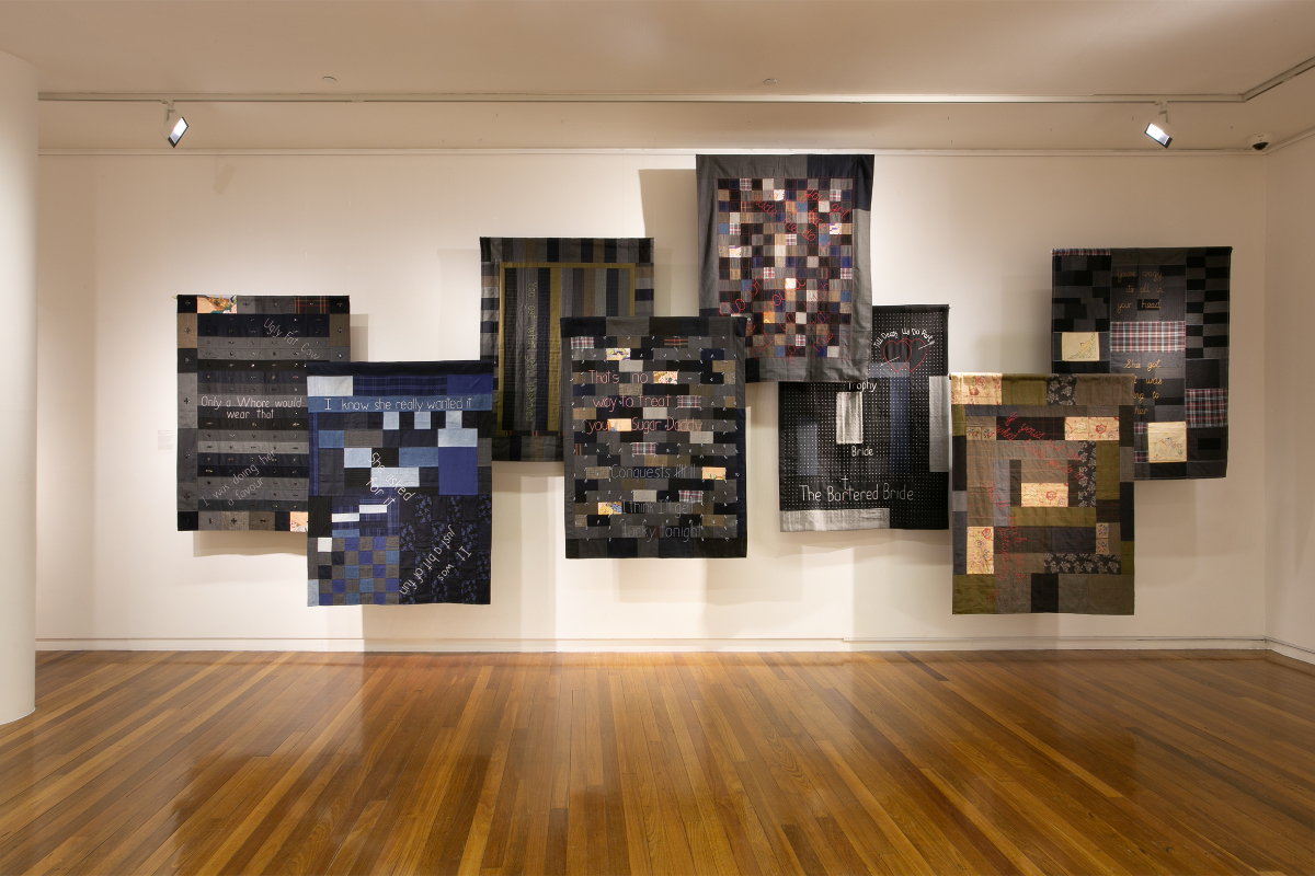 Made from men’s suiting fabric collected from op-shops and interspersed with swatches of florals, pinks and pastels, Coughlan’s comfort quilts are anything but. In some, fabric from schoolgirls’ uniforms sits biliously beside dark suiting material. The quilts bear embroidered sentences once spoken by perpetrators, recounted to the artist by her counselling clients. If you’d just do what I told you to do. She got what was coming to her. It was just a bit of fun. Their lazy brutality speaks of the enforced control and violent silencing so many women navigate throughout their lives, especially those surviving such ferocious assaults on their selfhood.