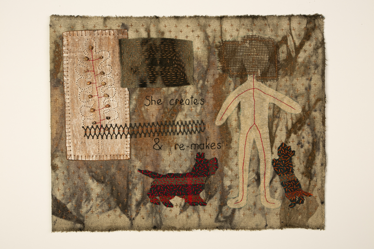 Two of the Reparation works are twin portraits. The first shows Mary birdlike with wings. During an episode of violence, she would disassociate from her body, flying up to the ceiling where she could look down at the scene below. In the second portrait, now in her undergarments, Mary is surrounded by dark feathers. Far from granting her freedom, these feathers are threatening, suffocating, symbolising the return from her airborne safety. As Coughlan said, ‘How do you make the coming back bearable?’ Yet in Reparation, in which the artist works to restore her child-self’s sense of belonging and self-worth, she has gifted herself a motif of hope: the scottie. The loyal companion of her adult life is by her side in art, a reminder she is safe in her embroidered world.