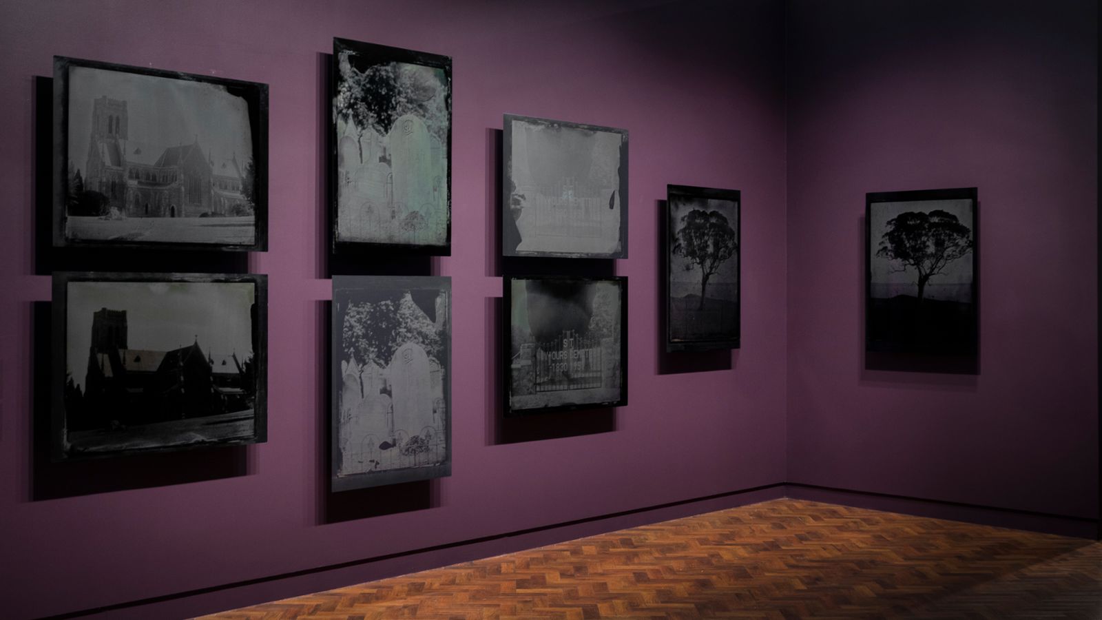 The unstable viewpoint Croft often favours is also evident, especially in the audio-visual work in which the layered drone footage and still images emulate the layering of memory and history. Nothing seems fixed, everything is in flux. The images derived from the tintypes achieve a similar instability through disturbances of the emulsion and the little losses of resolution that arose during the wet collodion process. Sometimes one can’t be certain if an image is coming into being or disappearing. In one spectacular image a flaw in the tintype’s emulsion strikes the ground like a meteor, flaring up with inexplicable energy.