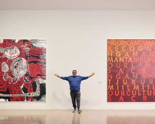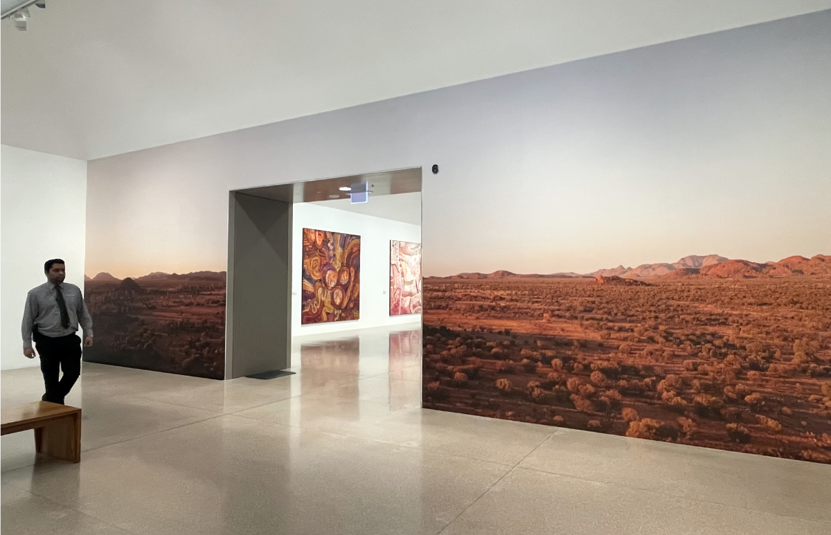 An earlier foundation story comes in a third darkened space abutting Ngura Puḻka containing superb watercolours by Albert Namatjira (and kin), the guy who got the whole thing going. His panoramic vistas and deft framing of landscape elements reinforce recent scholarship outing Namatjira as a photographer. They also demonstrate how immensity of space and distance can be condensed into intimate scale. It’s a strange piece of exhibition design that chose to echo the realism of Namatjira’s magisterial vision and the ambition of the epic canvases through locational photographs of desert country, wallpapered across dividing walls, explicitly describing the paintings’ origins but feeling like overt promotion for South Australian tourism. Another curatorial device is a short film featuring artist Tuppy Nginta Goodwin. To me, additions of this kind appear as institutional propaganda to authenticate the works—and by extension the artists—in an amplified version of the certificate of authenticity that buyers expect when purchasing Indigenous art. Pedagogical at best, such films seem aimed to challenge those who would deny the agency and integrity of the artists.