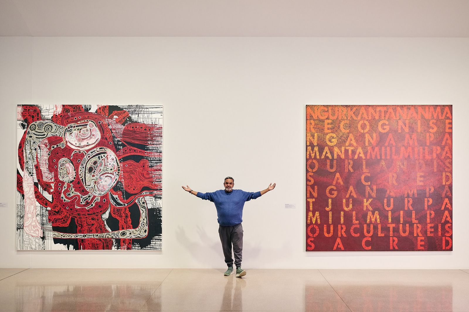 Several paintings have an animated, cartoon-like manner, from the spiky dot-laden structure in Theresa Baker’s Minyma Malilunya (2022) to Iluwanti Ken’s graphic/calligraphic black and white eagle stories, which never land for me but have been widely embraced by curators and collectors. Other stars attuned to the power of visual language in developing a distinctive style and the role of artists as cultural advocates—Zaachariaha Fielding, and his father Robert Fielding—are represented with signature works hanging abreast, Zaachariaha’s lace-like webs of viscous paint and Robert’s blocks of bilingual text declaring Country sacred. This is the underlying and overarching doctrine of Ngura Puḻka.