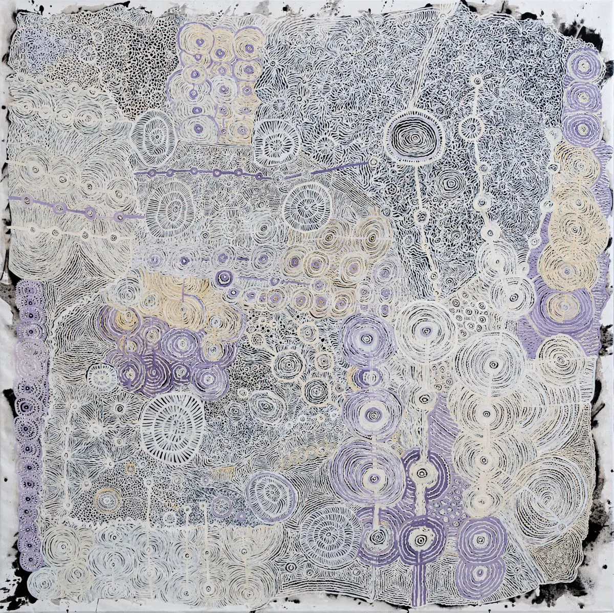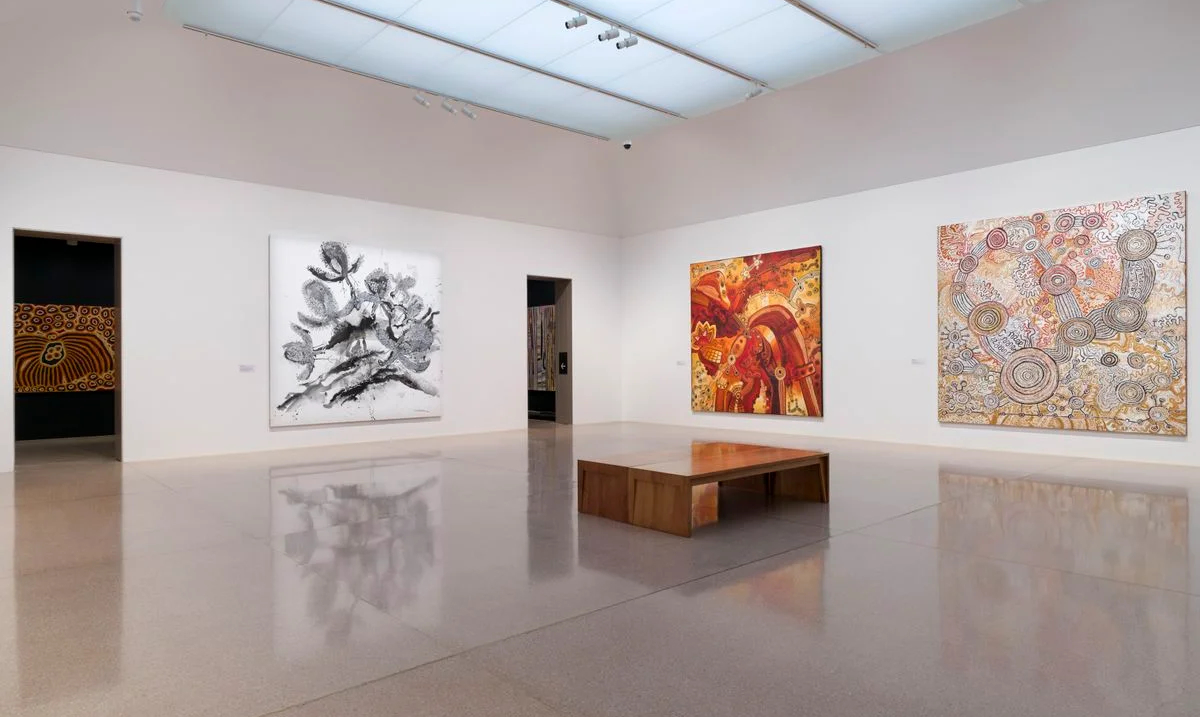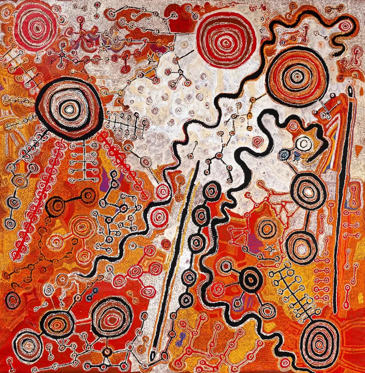 The Wildean claim that there’s no such thing as bad publicity glosses the pain and expense it causes, but creative resilience is being proven in Ngura Puḻka — Epic Country by artists from the Aṉangu Pitjantjatjara Yankunytjatjara (APY) Lands of South Australia. Finally on display at the National Gallery of Australia after a three-year postponement, the exhibition follows an excoriating trial by Murdoch’s News Corp Australia and scrutiny by government bureaucrats which included an independent review commissioned by the NGA into the authenticity of the works.[1] Missing in action has been any nuanced understanding or discussion of the cross-cultural studios these paintings are made in, or even how artists work, full-stop. Neither is there a real appreciation of the pragmatics of mostly elderly—and some frail—painters producing increasingly large-scale works to meet a strong market and institutional demand. What media and the state’s cultural leaders do understand is that Aboriginal art has implicit power to shape national narratives, (symbolically at least), and to be manipulated for effect by both ends of the political spectrum. To weigh in on the paintings—for, or against—implies factional alignment. It’s time the canvases spoke.
