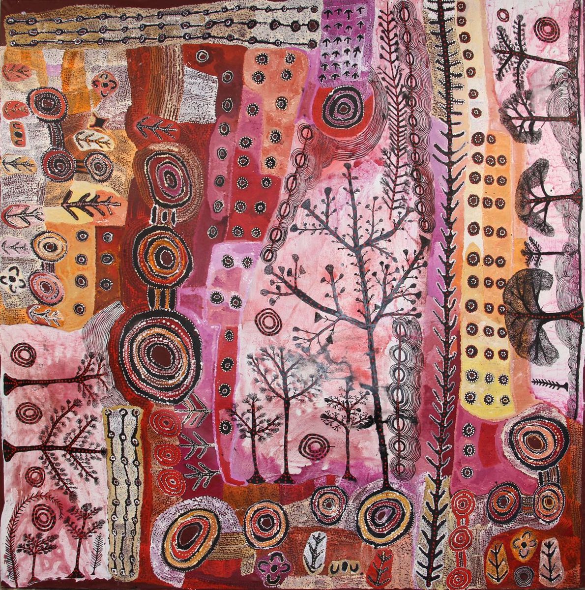 That said, collaboration is at the heart of the exhibition in method and form. This is old news across contemporary Aboriginal art and political movements — from the Yirrkala Church Panels (1962–63) to Papunya Tula’s dialysis fundraiser canvases initiated in 2000 and the magnificent Great Sandy Desert native title claim canvases such as Ngurrara II (1997), currently in the Biennale of Sydney, AGNSW, adjacent to on-and-off-the-canvas-murals by APY artist Yaritji Tingila Young. (Her honey ant/tjala Tjukurpa is in Canberra too, defiantly coiling in every colour.)