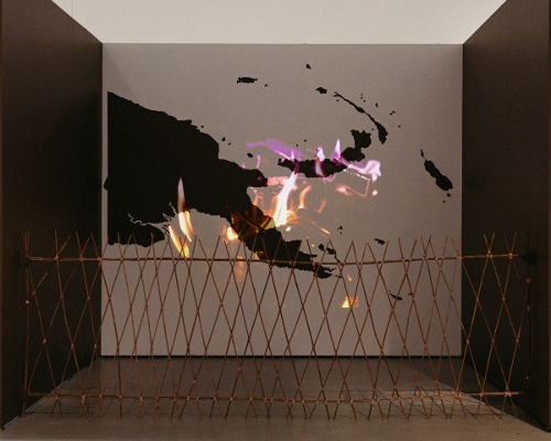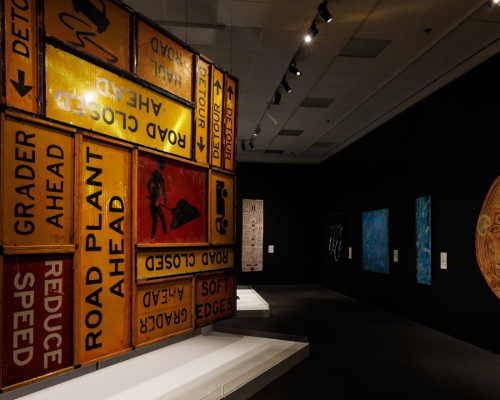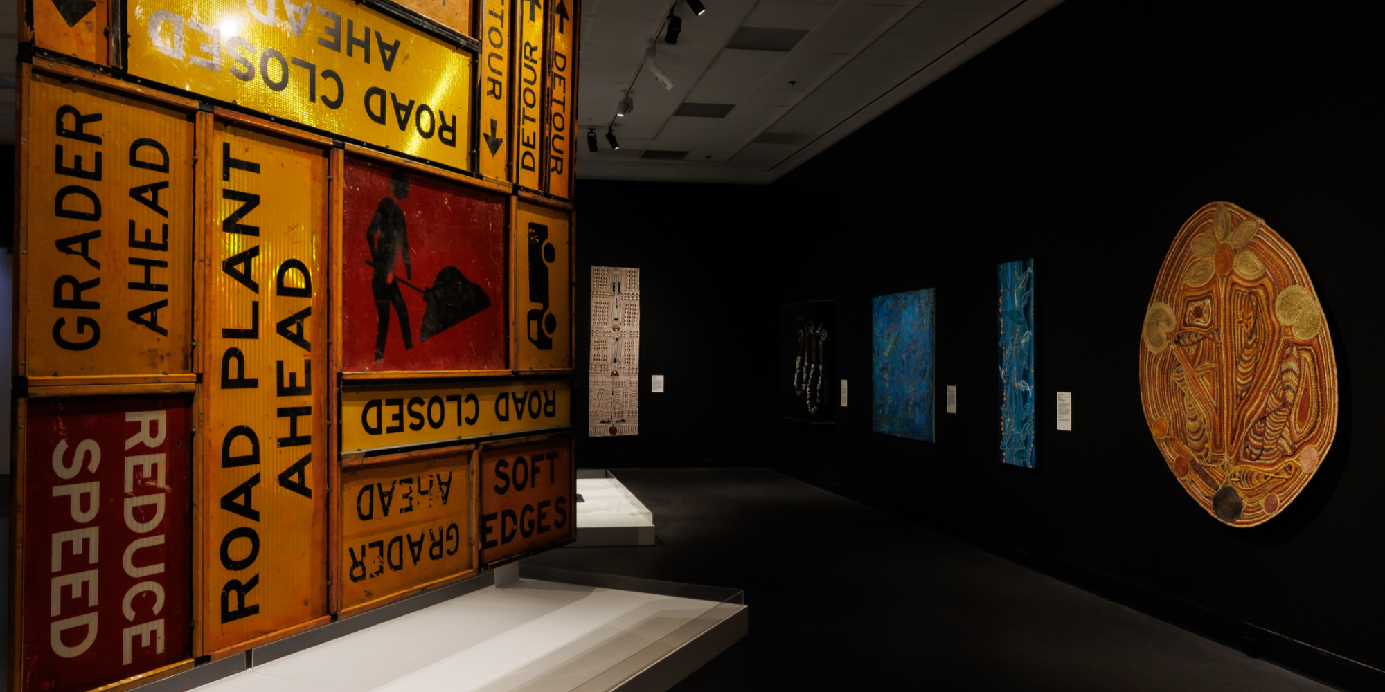 From left, Gaypalani Waŋambi, Burwu, blossom 2025, (back view, detail). Installation view, 2025 NATSIAAs, Museum and Art Gallery of the Northern Territory. Photo courtesy of MAGNT / Georgina Campbell.